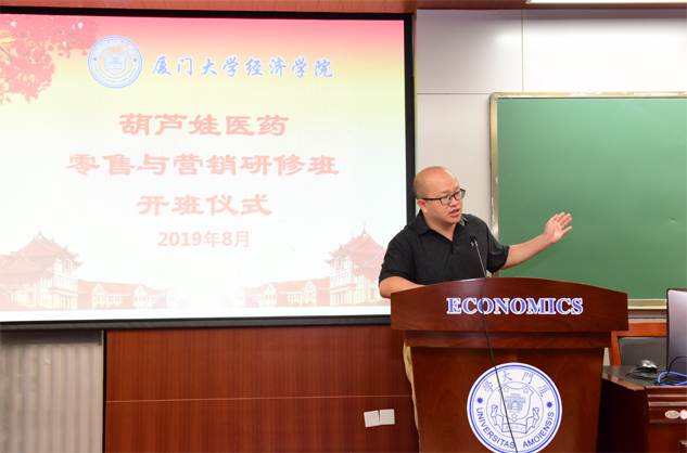 在开班仪式上,廖景峰主任首先代表厦门大学经济学院热烈欢迎乐天使医药零售与营销研修班的学员到厦大学习,并就厦门大学及经济学院的相关情况进行了介绍。他说,乐天使学员走进厦大就是厦大的校友,希望未来的日子能够关心、支持母校的发展,多提宝贵意见,同时他也祝大家在厦大学习期间学有所成、学有所获。
